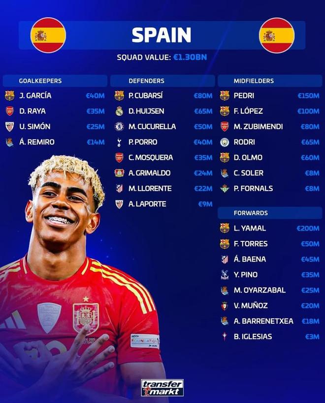 北京时间3月21日,在西班牙国家队公布新一期大名单之后,德转列出了西班牙队此次27人大名单的身价排行榜,亚马尔2亿欧元第一,佩德里1.5亿欧元第二,费尔明-洛佩斯1亿欧元第三。